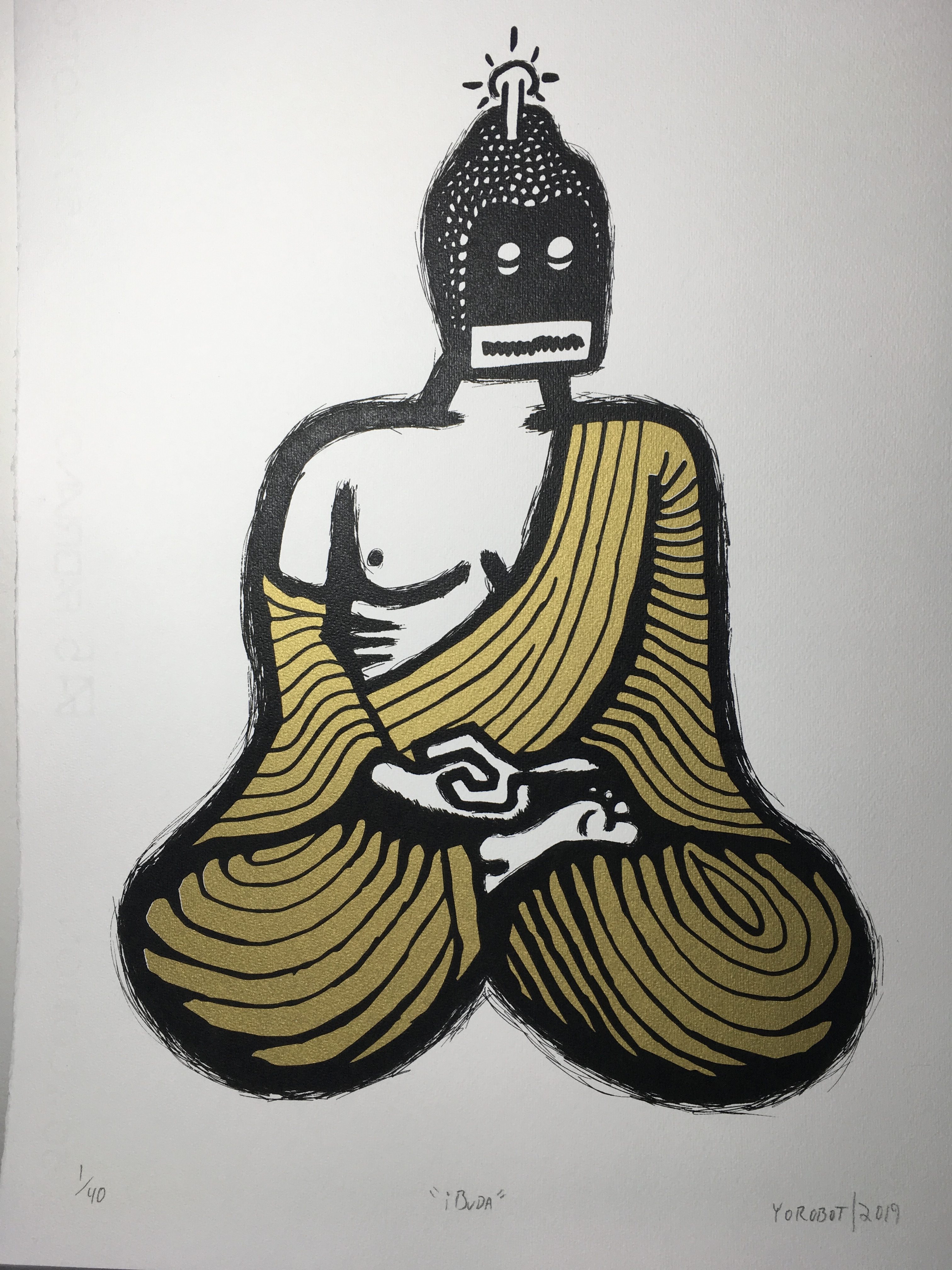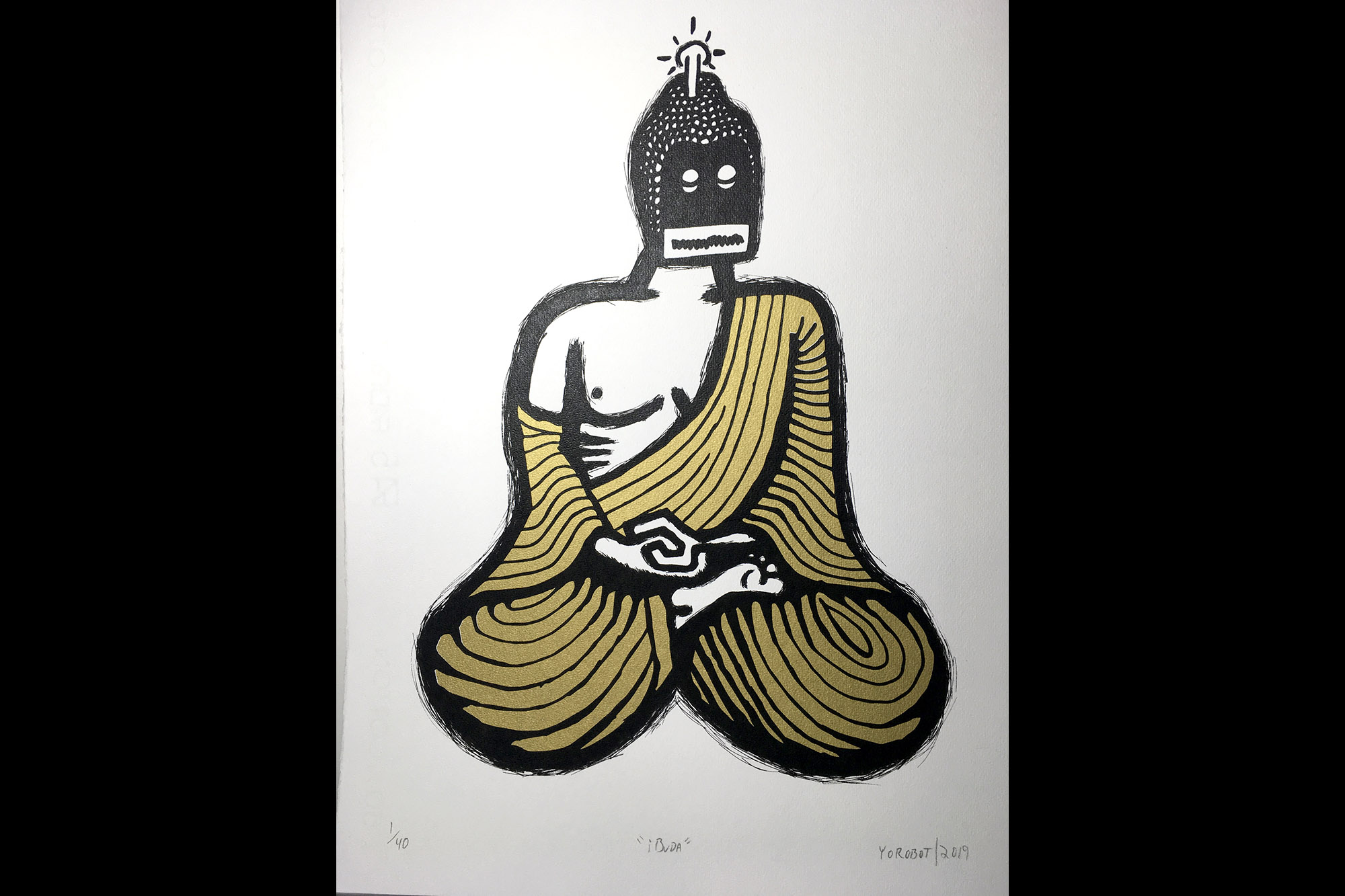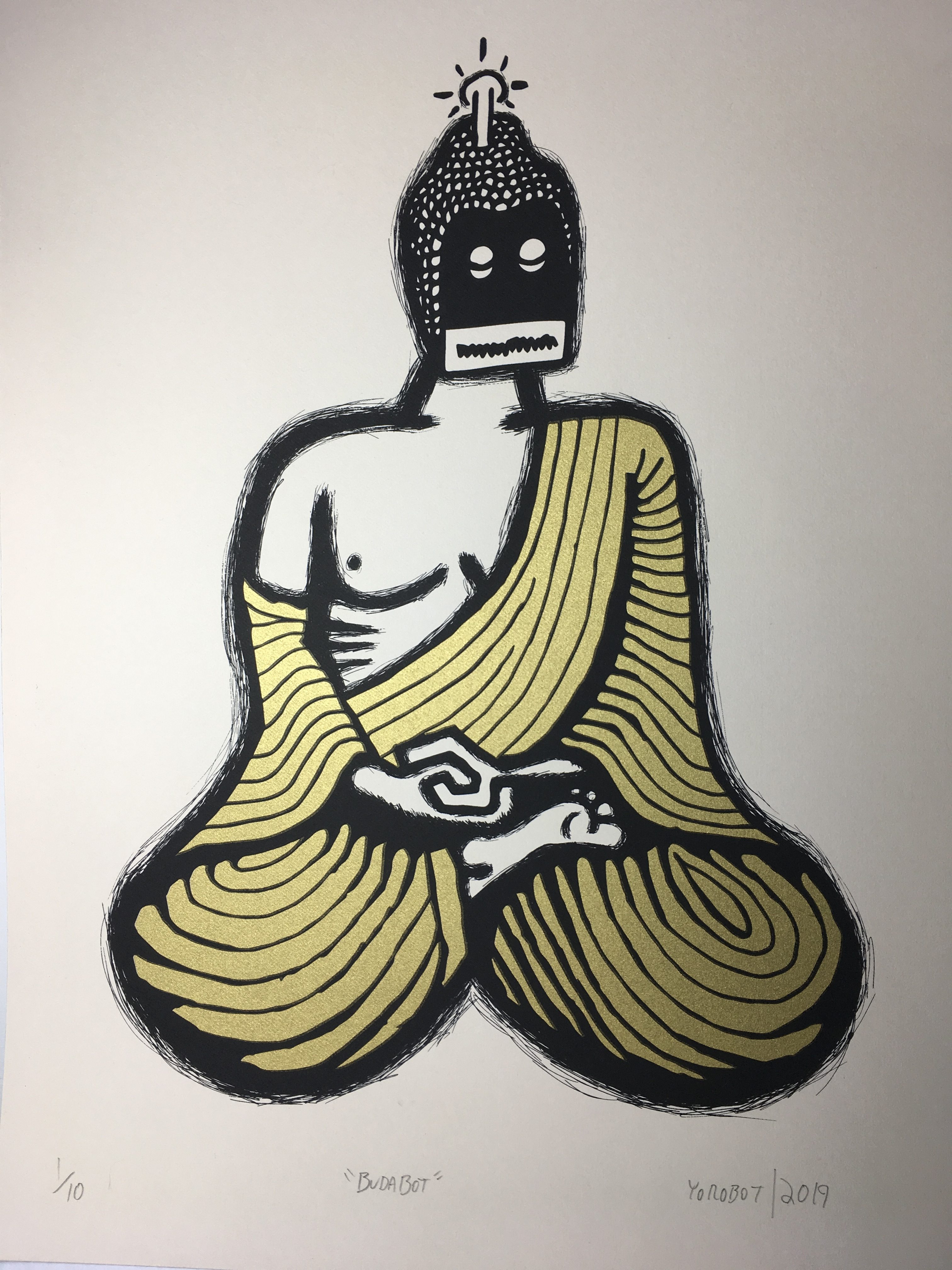 Serigrafía a 2 tintas (negro y dorado) impreso sobre papel Fabriano blanco (50% algodón / 160 gr.) y marfil (60% algodón / 220gr.) Medida 50cm X 35cm. Edición limitada de 40 / 10 piezas, numeradas y firmadas por el artista «YOROBOT».