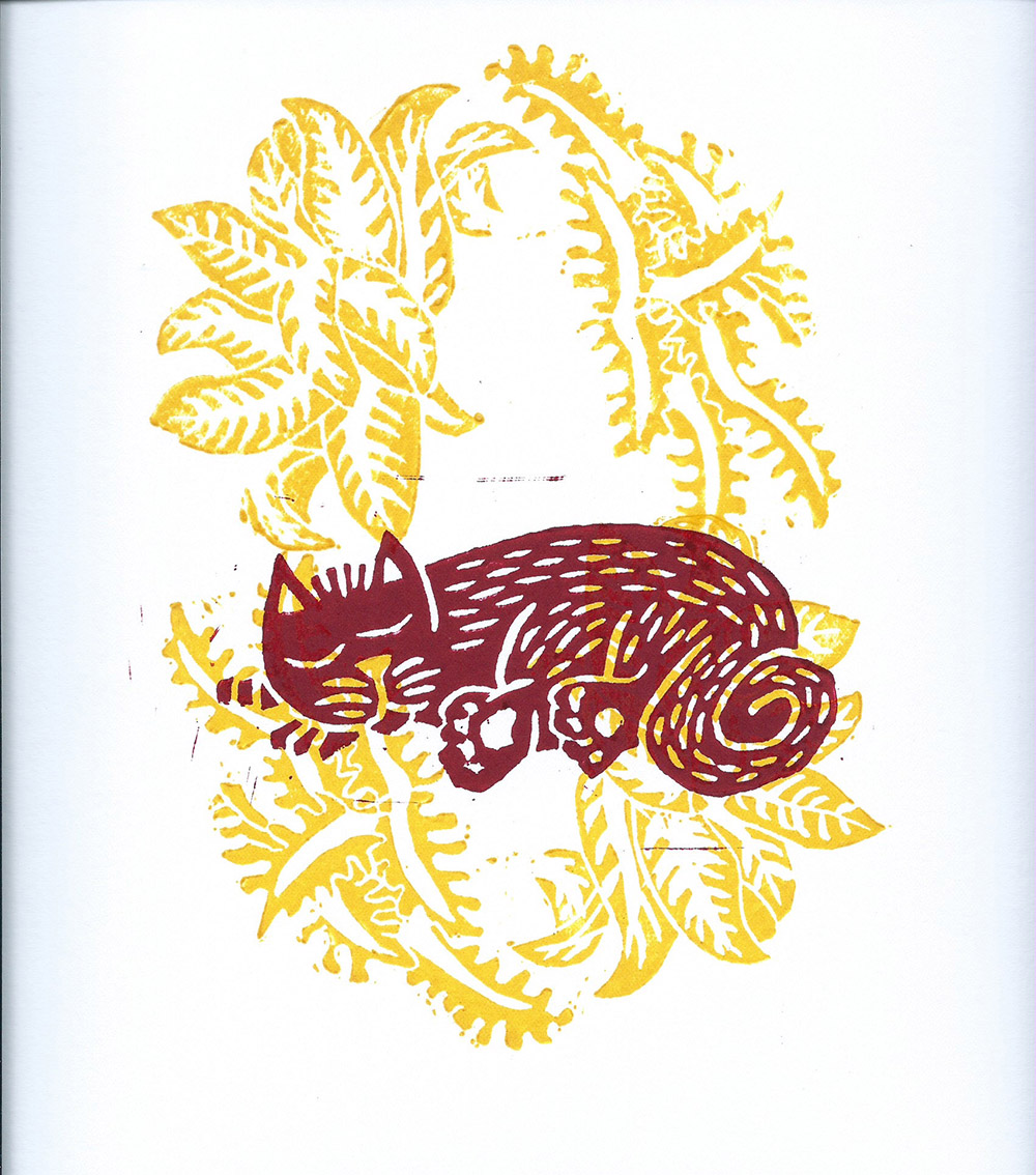 Impresión con linograbado* sobre papel Fabriano Rosaspina blanco 60% algodón a 2 tintas. Medida 23cm de ancho X 25cm altura.